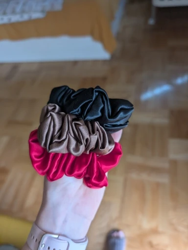 Gather your hair into a ponytail, bun, or braid. Wrap the silk scrunchie around the hair 2–3 times, depending on thickness, until it's comfortably secure. Silk holds gently to prevent breakage, creases, and tension on your scalp.